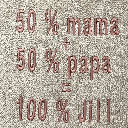 Gepersonaliseerde slab '50% mama +50% papa = 100%' - geborduurd